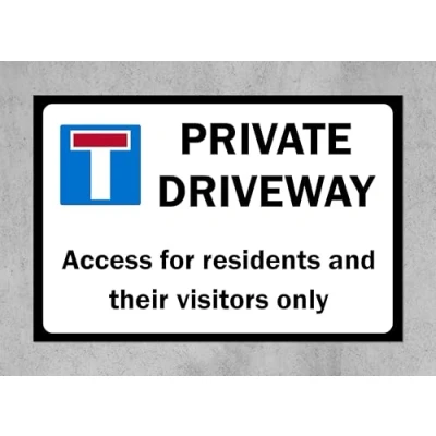 Private driveway access for residents and their visitors only Sign 3mm Aluminium sign Digitally printed and laminated for extra durability 10mm Radius rounded corners, no sharp edges