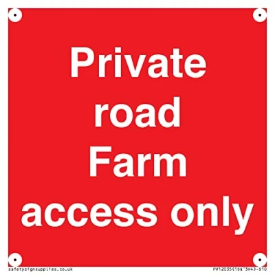No Symbol This sign is made from plastic semi-rigid 1mm Comes with3mm Corner Holes. 1mm thin plastic sign, can be screwed, stuck with adhesive, or attached with cable ties. Not suitable for hanging. S10 square Sign Text: Private road Farm access only