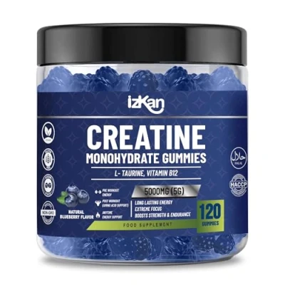 ⭐ 𝗜𝗭𝗞𝗔𝗡 𝗚𝗨𝗠𝗠𝗜𝗘𝗦 𝗜𝗡𝗦𝗧𝗘𝗔𝗗 𝗢𝗙 𝗣𝗢𝗪𝗗𝗘𝗥: Natural Blueberry-flavored Creatine Monohydrate Gummies pack your daily dose of 5g Creatine Monohydrate for fitness enthusiasts, bodybuilders and both male and female athletes. Take 4 Creatine Gummies daily for a 5000mg serving of Creatine Monohydrate. We offer 120 Gummies per bottle for a 30-day supply. 💪 𝗘𝗻𝗵𝗮𝗻𝗰𝗲𝗱 𝗠𝘂𝘀𝗰𝗹𝗲 𝗣𝗲𝗿𝗳𝗼𝗿𝗺𝗮𝗻𝗰𝗲 & 𝗘𝗻𝗲𝗿𝗴𝘆 𝗕𝗼𝗼𝘀𝘁: Elevate your fitness routine with our Creatine Monohydrate Gummies, formulated to improve muscle strength, enhance recovery, and boost endurance. The addition of L-Taurine and Vitamin B12 supports sustained energy levels and overall performance. Whether you're looking to increase your muscle mass, recover faster post-workout, or enhance your endurance, our gummies provide the essential nutrients needed to achieve your fitness goals efficiently. ⭐ 𝗧𝗘𝗦𝗧𝗘𝗗 & 𝗧𝗥𝗨𝗦𝗧𝗘𝗗 𝗦𝗨𝗣𝗣𝗟𝗘𝗠𝗘𝗡𝗧: Creatine monohydrate, one of the most studied supplements, is renowned for its safety profile and effectiveness, particularly when paired with a consistent exercise regimen and nutritious diet. Creatine is one of the most well-known sports supplements on the market, and ours uses the most effective monohydrate form for optimal results. 💪𝗖𝗢𝗚𝗡𝗜𝗧𝗜𝗩𝗘 𝗘𝗡𝗛𝗔𝗡𝗖𝗘𝗥: Improve focus and mental sharpness with our Creatine Gummies, which are gluten-free, vegan-friendly, and free of artificial colours or preservatives. ✔️𝗩𝗘𝗚𝗔𝗡 & 𝗖𝗟𝗘𝗔𝗡 𝗜𝗡𝗚𝗥𝗘𝗗𝗜𝗘𝗡𝗧𝗦: We are committed to aligning with your values and nutritional choices. Our Creatine Monohydrate Gummies are Halal, Non-GMO, and Vegan, making them suitable for a variety of dietary needs. They are gluten-free and free from artificial colors, ensuring a clean, wholesome product. Enjoy the benefits of our fitness gummies without compromising on your principles or the quality of ingredients you put into your body ✔️ 𝗙𝗨𝗟𝗟 𝗦𝗔𝗧𝗜𝗦𝗙𝗔𝗖𝗧𝗜𝗢𝗡 𝗚𝗨𝗔𝗥𝗔𝗡𝗧𝗘𝗘 - Highest Quality & Safety Standards: Our gummies are produced in a cGMP-certified facility, ensuring they meet the highest standards of quality and safety. Each batch is rigorously tested to guarantee top-grade quality and stable efficacy. We prioritize your health and satisfaction, delivering a product you can trust. Join countless satisfied customers who have experienced the benefits of our meticulously crafted gummies, designed to support your fitness goals effectively and safely.