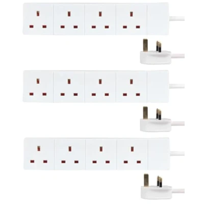 PRO ELEC 4 Gang Mains Extension Lead, 2m, White 3 Pack, 13A UK Plug, BS 1363/A Compliant