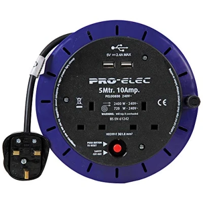 Pro Elec PEL00800 10A 2 Gang Cassette Reel mains Extension with 2x USB Charging Ports, 5 m,Blue