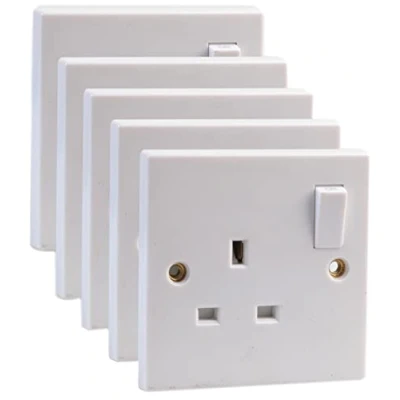 Pack of five, 1-gang, switched mains sockets White, moulded finish Requires 25mm back box (not supplied) Rated at 250V, 13A | Compliant with BS 1363 Supplied with fixtures | Dimensions (WxH): 145x85mm