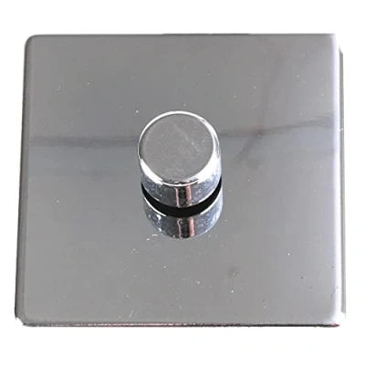 1-gang, screwless light dimmer switch with polished chrome finish Rotary on/off switch 250W max. load rated Supplied with fixing screws Dimensons (WxH): 85x85mm