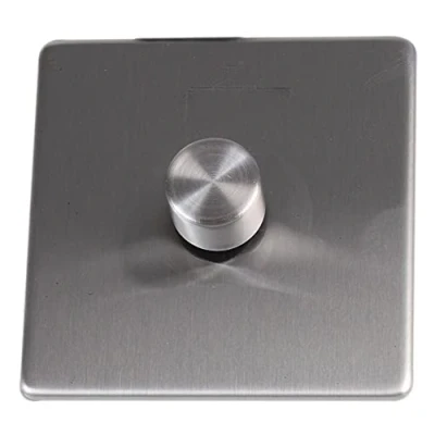 1-gang, screwless light dimmer switch with stainless steel finish Rotary on/off switch 250W max. load rated Supplied with fixing screws Dimensons (WxH): 85x85mm