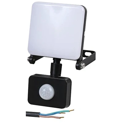 Compact yet powerful LED floodlight with a built-in PIR sensor for added security Adjustable time, sensitivity and lux settings Robust aluminium body Daylight white (6,500K) LED colour temperature Fitted with 1m, bare-ended mains cable | Non-dimmable | Detection range: 8m