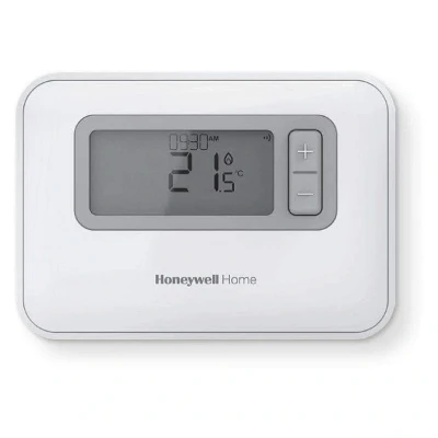 The T3R thermostat ensures automatic time and temperature control for home heating systems. It's compatible with 24-230V appliances, including heat pumps, gas boilers, combi boilers, and zone valve applications. It does not support electric heating but works with OpenTherm appliances. The T3R features a modern design and displays set point temperatures and alert messages for fault detection. It includes a thermostat and receiver box. It offers language selection, cycle rate, upper and lower set point limits, minimum on/off time, and a temp display offset. Users can choose between daily, weekly, or 52 schedule options with four periods a day. Additional features include a clock with daylight saving adjustments, a fail-safe mode, and a wired remote sensor. Factory reset and binging are exclusive to T3R.. Honeywell Home T3R Thermostat - Wireless