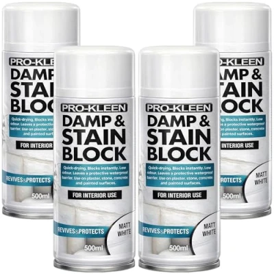 Pro Kleen Damp & Stain Block Spray Paint Primer White Matt 4 x 500ml Covers Damp, Mould, Grease, Nicotine Rust Stains for Walls Ceilings Leaves a Waterproof Barrier