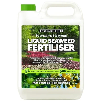 ORGANIC SEAWEED FERTILISER: Experience the power of Pro-Kleen's Liquid Seaweed Fertilizer, offering a comprehensive blend of essential nutrients to support your plants, vegetables, fruit, grass & more. Our specialized formula is designed to stimulate rapid and robust growth, ensuring that your crops thrive CONTAINS 100% NATURAL & ORGANIC SEAWEED: Unlike other fertilisers, Pro-Kleen's formula contains natural and organic seaweed. Seaweed boasts exceptional properties that promote plant health by improving stress tolerance, nutrient absorption, growth, root development, flowering, and even reducing seed dormancy. Derived from seaweed, Pro-Kleen's fertilizers contain polysaccharides, proteins, and fatty acids, all of which contribute to better moisture and nutrient retention, resulting in stronger, healthier plant growth! SUITABLE FOR A VARIETY OF PLANTS: This garden fertilizer is suitable for use on grass, soil, fruit, vegetables, flowers, shrubs, lawns & trees ENRICHED FORMULA: Our enhanced formula includes amino acids, trace elements, trace minerals, and iron, providing your grass, vegetation, flowers, and more with everything they need for optimal growth. Amino acids play a crucial role in regulating root and flower development while stimulating overall growth. Trace elements and minerals promote robust growth and contribute to the overall health and strength of plants. Iron facilitates the vital transportation of oxygen within the plant, aiding its distribution through roots, leaves, and other plant parts. Together, these elements yield exceptional results, ensuring the flourishing of your plants! CONCENTRATED FORMULA: Just one 5-litre bottle can provide up to 500 treatments! It’s a super easy-to-use formula to make sure your plants look and grow better than ever.