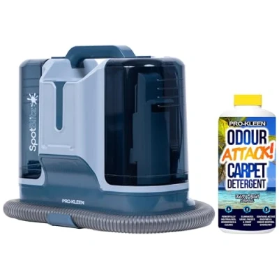 Prokleen Spotblitz Carpet & Upholstery Cleaner – Powerful, Quiet & Versatile Stain Removal: Bring your carpets, rugs, and furniture back to life with the Prokleen Spotblitz – the compact cleaner designed to tackle everyday messes and tough stains with ease. Powerful Deep Suction: Remove stubborn stains like wine, coffee, ink, and pet accidents in minutes. With 13 kPa suction power, this 450W motor lifts dirt and liquid fast—leaving fabrics fresh and spotless. Quiet & Efficient Cleaning: Engineered for performance without the noise. At just 78 dBA, Spotblitz delivers powerful results while keeping things pleasantly quiet. The 1.2m hose and 5m cable give you the reach to clean multiple areas without hassle. 5 Versatile Attachments: Whatever the job, Spotblitz has the tool. Includes a precision spot cleaner, deep stain brush, crevice tool, glass cleaner, and a handy self-cleaning function to keep your machine fresh. Compact & Lightweight Design: At only 3.8kg and measuring 30 x 38 x 23 cm, this cleaner is easy to carry, store, and use anywhere in your home or car. 1L Deep Clean Carpet Solution: Supplied with 1L deep cleaning odour attack carpet shampoo with an ocean fresh fragrance. Eliminates stains like urine, faeces and vomit odours, wine, ketchup and more, suitable for all types of carpets and upholstery. Contains non-pathogenic (harmless) bacterial spores and enzymes that actively digest stain proteins successfully that cause malodours (unpleasant smells)., Weight: 8.377565956 pounds, Manufacturer: Pro-Kleen