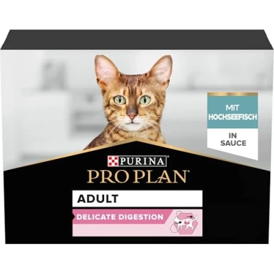 Complete and balanced Adult 1+ Wet Cat Food tailored to cats with sensitive digestion PURINA PRO PLAN Delicate Digestion is specially formulated with high-quality selected ingredients, including Ocean Fish to help promote digestive health Pouches help manage Sensitive Skin thanks to high levels of omega 3 and 6 fatty acids Made with ocean fish in a delicious gravy for a tasty wet recipe that cats love to eat Science Based Nutrition developed with Purina veterinarians