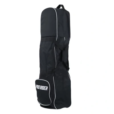 DURABLE: The Pro Rider Wheeled Golf Travel Cover has a nylon construction for extreme durability and additional internal padding to protect clubs during transit HARD-WEARING: Hard-wearing in-line wheels with half-back, kick-plate rails for increased protection and mobility EASY CARRY: With padded grab handles on top and side of travel cover and two external carry straps with quick release buckles, the Pro Ride Wheeled Golf Travel Cover is both convenient and comfortable. STORAGE: Front pockets offer additional storage space for accessories; perfect for travelling. SIZE: Can accommodate all golf bags with a top cuff smaller than 10"