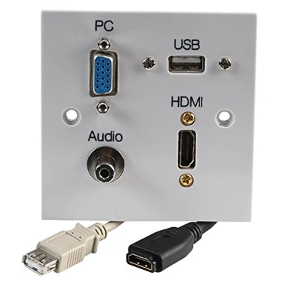 All-in-One Multimedia Wall Plate – Neatly integrates HDMI, USB Type A, VGA and 3.5mm audio into a single UK-standard faceplate. Plug & Play Design – No soldering or crimping required; simply connect via rear socket leads for quick and easy installation. Ideal for AV Setups – Perfect for wall-mounted TVs, home cinemas, offices and meeting rooms – eliminates messy cables. HDMI 1.4 Compliant – Supports Full HD video, audio and data transfer via high-speed HDMI. Compact & Compatible – Fits UK standard 1 gang back box (minimum 30mm depth); durable white plastic faceplate.