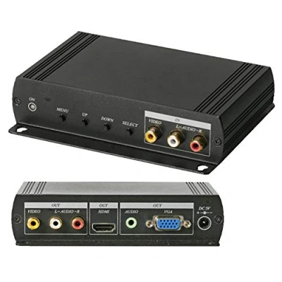 Simultaneously displays all 3 outputs at the same time Inputs: 3x Phono sockets for Composite video & L/R Audio Outputs: VGA, 3.5mm stereo jack, HDMI & Composite video & L/R Audio phono sockets Dimensions (WxHxD): 140 x 32 x 111mm (including mounting brackets)