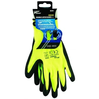 Pro User BB-RG141 high Vis crinkle latex gloves These gloves are manufactured from superior latex with a crinkle finish & offer good protection against tears & cuts. They are ideal for mechanical tasks, assembly & handling, gardening & horticulture. They are approved to EN388: 2003 & EN420: 2003 in accordance with the PPE directive 89/686/EEC. Mechanical hazard rating: 2.1.2.1 CE category II coating: latex liner: polyester