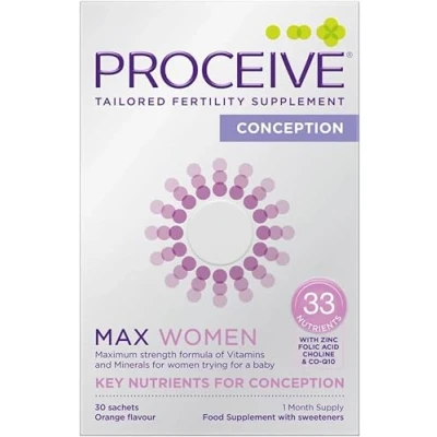 MAX STRENGTH SUPPLEMENT FOR WOMEN TRYING FOR A BABY - Proceive Women Max is a powdered, maximum strength fertility supplement to support the nutritional needs of women trying to conceive. The Max range is recommended for women over 35 or any woman who has been trying to conceive for over a year. All Proceive products are guaranteed to be fresh, in date and arrive in the latest packaging. CONTAINS 33 KEY NUTRIENTS FOR WOMEN BEFORE PREGNANCY - Nutrients play an huge role in the development of the egg, womb preparation, and hormone regulation. Each capsule provides 33 vitamins, minerals, and amino acids, including: Zinc, Folic Acid, Co Q10, and Vitamins D, B12, B6, C, and E. HOW PROCEIVE MAX WOMEN WORKS TO HELP CONCEPTION - Zinc contributes to normal fertility and reproduction, Vitamin D contributes to the normal function of the immune system, Vitamin B12 has a role in the process of cell division, and Folic Acid contributes to normal maternal tissue growth during pregnancy. ONE MONTH SUPPLY, ONE SACHET PER DAY - Take one sachet per day with approximately 300ml of water or juice, preferably on a full stomach. Proceive Women Max can be taken for up to 3 months before you start trying for a baby. AWARD-WINNING FORMULA DEVELOPED BY EXPERTS - Proceive is a multi-award winning range of scientifically formulated fertility and pregnancy supplements developed by fertility experts. No filler, binders or preservatives. CERTIFIED VEGAN. PROCEIVE TIP: Use a shaker with 300ml liquid for best results. If settling occurs, simply shake/stir again or blend into a yoghurt.