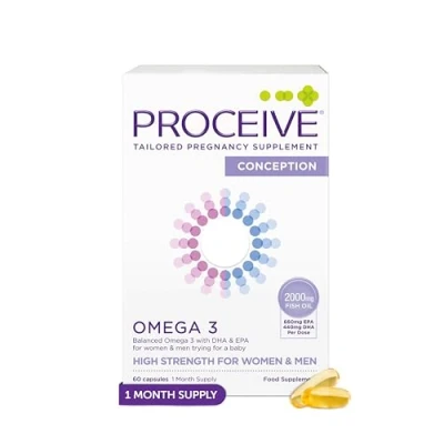 OMEGA 3 FOR WOMEN & MEN TRYING FOR A BABY Proceive Omega 3 Conception is the ideal supplement for women and men preparing for pregnancy and trying for a baby. Omega 3 fatty acids are important for every cell in the body, including sperm and egg cells. SUPPORTING GOOD PRE-CONCEPTION HEALTH Omega 3's are essential for during pre-conception, when sperm and egg cells develop and mature. Getting all the Omega 3 you need can be difficult if you don't eat a lot of oily fish. HIGH STRENGTH PURE FISH OIL WITH EPA & DHA - With levels based on the latest scientific studies, this product offers a high strength dose of 2000mg fish oil, with an ideal Omega 3 ratio of 3:2. Contains 660mg of EPA and 440mg of DHA per dose, the optimum strength when trying to conceive. SUPPORTING GOOD PRE-CONCEPTION HEALTH - Omega 3's are essential for during pre-conception, when sperm and egg cells develop and mature. Getting all the Omega 3 you need can be difficult if you don't eat a lot of oily fish. This is where Proceive Omega 3 can help. EFFECTIVE & SIMPLE TO USE (60 CAPSULES) - Women & Men: Take two capsules once per day. We recommend taking Proceive Conception Omega 3 three months before trying for a baby and continue for as long as required. Can be taken with Proceive Conception vitamins. SUSTAINABLY SOURCED FISH OIL - Proceive omega 3 fish oil is certified Friend of the Sea, sustainably sourced from sardines fished off the South American Coast. Free from PCBs and heavy metals. ALLERGENS: Contains fish (not suitable for vegans or vegetarians). Proceive Conception Omega 3 is also IFOS Certified.