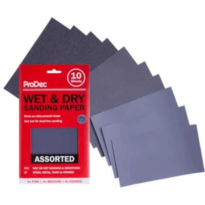 ProDec 10 Pack Assorted Grades Wet & Dry Abrasive Sandpaper for Sanding Wood, Furniture, Metal, Plaster, Decorating, Automotive 9 x 5.5 inch (230 140mm) Sheets, and