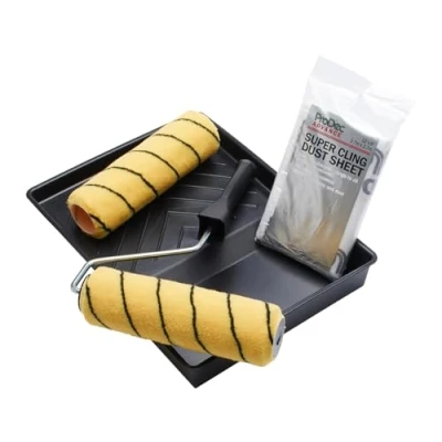 4 piece 9” (225mm) trade quality roller kit ideal for interior walls and ceilings 2x durable woven synthetic fabric paint rollers for a smooth finish with 12mm medium pile ideal for emulsions (eg. matt, silk, eggshell) and masonry paint on smooth and semi-smooth surfaces Rugged plastic handle cage roller frame with push fitting for extension poles Black tray made from 100% recycled plastic Free 12'x9' (3.7m x 2.7m) sheet of ProDec's Super Cling polythene dust sheet MORE INFORMATION BELOW in the 'From The Manufacturer' section - click on 'See More Product Details' or scroll down, Manufacturer: Rodo Ltd
