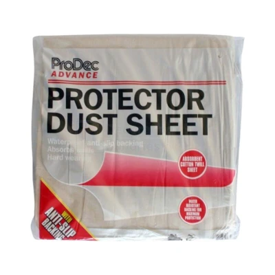 General description This absorbent cotton dust sheet is suitable for various jobs around the home. It is water-resistant and features an anti-slip polythene backing, providing maximum protection against dust and spills. Technical specifications Dimensions: 3.7m x 3.7m (12' x 12') Material: Cotton twill with polythene backing Usage Absorbs paint and liquid spills Prevents tread through to carpets and floors Anti-slip coating prevents movement even on smooth floors