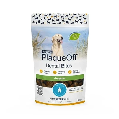 100% NATURAL & CLINICALLY PROVEN ORAL CARE: Made with A.N ProDen, a natural and organic seaweed ingredient from the pristine Scandinavian coastline — clinically proven to reduce plaque and tartar while improving bad breath. The perfect way to care for your dog’s oral health naturally. VOHC ACCEPTED & VET RECOMMENDED: Accepted by the Veterinary Oral Health Council (VOHC) for its proven effectiveness in promoting good oral hygiene. Trusted by veterinarians worldwide, ProDen PlaqueOff offers safe, reliable, and visible results for dogs of all breeds and sizes. HEALTHY & TASTY DAILY REWARD: With no added sugar, artificial preservatives, or coloring, these Dental Bites are a guilt-free, healthy treat for your dog. A delicious reward that supports cleaner teeth and fresher breath — perfect for daily training or bonding moments. EFFECTIVE PLAQUE & TARTAR CONTROL: The active seaweed formula works naturally through your dog’s saliva to help prevent plaque buildup and control tartar formation, keeping their teeth cleaner and breath fresher with consistent use. EASY DOSING FOR ALL DOG SIZES: Available in 60g (for small dogs) and 150g (for larger breeds). Feed 4–5 bites daily for dogs up to 10kg, 2–4 bites for medium dogs (10–25kg), and 4–5 bites for large dogs (25kg+) — a convenient way to maintain daily dental health.