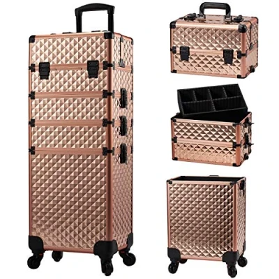 Professional 4 in 1 Large Makeup Trolley Beauty Cosmetics Vanity Organizer Rolling Make up Train Case Hairdressing Storage Box with Universal Wheels and Key Locks Tiers (Rose Gold)