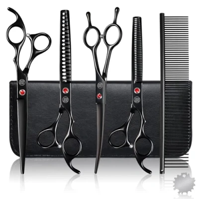 8 in 1 Grooming Scissors:Moontay Professional Dog Grooming Scissors Set includes everything you need for pet grooming: straight scissor, curved scissor, thinning scissor, fishbone scissor, pet comb, tension adjuster, cleaning cloth, and storage case. This set covers all grooming needs, whether for precise detailing or thinning fur. Professional Quality:Made of premium 440C stainless steel, the dog grooming scissors set features sharp and durable blades for precise cutting. Whether it's for fine details or larger cutting tasks, these dog scissors meet all requirements, delivering the perfect grooming results for your pet. Comfort and Durability:Each pet grooming scissor is equipped with ergonomically designed handles and a finger rest for stable and comfortable handling, making it easy to work even for extended periods. Rubber bumpers reduce noise while cutting, helping to calm your pet and minimize stress during grooming sessions. Versatile Use:Moontay pet grooming scissors set is suitable not only for dogs but also for cats and other furry pets. Whether for long-haired or short-haired breeds, this set provides the perfect solution for home use or professional groomers. Portable Storage:The grooming scissors set comes with a convenient storage case, making it easy to keep all tools organized and transport them safely. The cleaning cloth and adjustment key ensure that your dog scissors remain in optimal condition, allowing for smooth and seamless grooming every time.