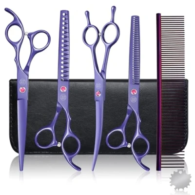 Professional Dog Grooming Scissors Set, 7 Inch/8 Inch Pet Chunkers Shears for Dog, Curved Scissors, Thinning with Comb (7 inch, Purple)