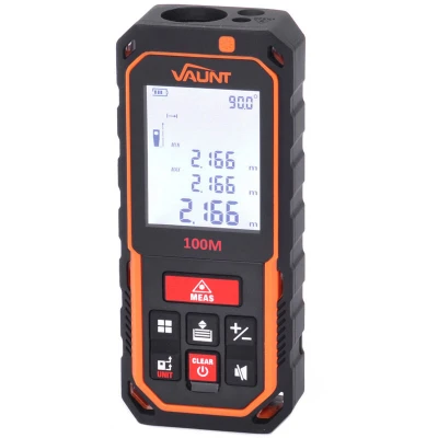 General description The Vaunt Professional Red Laser Distance Measure 100m is an essential tool for measuring distances, volumes, and areas both indoors and outdoors. It features a quick measurement display on a 2.0” black on white LCD screen, and its IP65 rating ensures protection against dust and water from any direction. The device is equipped with an anti-shock system to safeguard its internal circuitry. Technical specifications Working range: up to 100m Accuracy: ± 2.0mm Display: 2.0” black on white LCD screen Protection rating: IP65 Internal memory: stores up to 20 previous measurements Compatibility and accessories Includes: 1x Vaunt Professional Red Laser Distance Measure - 100m 1x USB Charger 1x Vaunt Laser Pouch 1x Wrist Strap 3x Rechargeable AAA Batteries Usage Measures length, area, volume, and continuous measurements. Features 2-point and 3-point Pythagorean calculations for measuring without a clear line of sight. Can calculate the height of structures and the width of