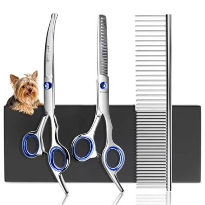 Stainless Steel One-Piece Design: Our dog grooming scissors feature hand-polished stainless steel blades with an integrated handle for extra strength, corrosion resistance and smooth cutting even after long-term use Safe Rounded Tip: No need to worry about poking your pet’s skin. all dog grooming scissors come with rounded tips for safe trimming, especially around the face, ears, eyes, nose and paws Ergonomic Handle: Dog grooming scissors with soft, non-slip rubber rings for a comfortable grip. Reduce hand strain during grooming. Removable finger rings fit different hand sizes for fatigue-free use Reinforced Adjustable Screw: Ensures smooth, stable cutting and prevents loosening. each dog grooming scissors set is balanced and aligned before leaving the factory for long-lasting precision. Complete Set: Curved scissors, thinning scissors and grooming comb. dog grooming scissors set suits all coat types and areas — ideal for home or professional grooming., Weight: 0.551155655 pounds, Manufacturer: TRIGRAND
