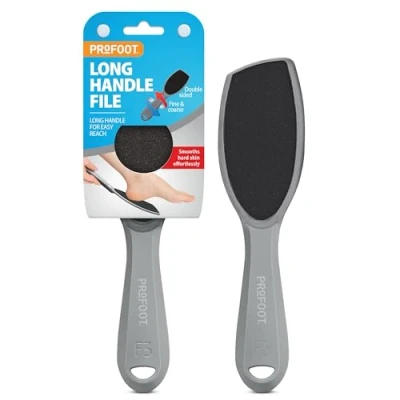 LONG HANDLE FOOT FILE - The Profoot Long Handled Foot File makes achieving soft, smooth feet easy by effectively removing hard skin and calluses with minimal effort. DOUBLE SIDED FOOT FILE - Featuring both fine and coarse sides, this foot file is tailored for specific skin conditions, providing a comprehensive solution for all your foot care needs. USE WET OR DRY - Suitable for use on both wet and dry skin, the Profoot Foot File adapts to your personal foot care regimen, ensuring effective results in any condition. EXTENDED REACH DESIGN - The long handle design ensures you can comfortably reach all areas of your feet, including the most difficult spots, offering superior control and comfort. TRANSFORMS FEET - With a wide head and a comfortable handle, this foot file provides unparalleled comfort and control, transforming your foot care routine into an effortless experience.