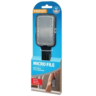 The Profoot Micro File easily removes hard skin and calluses with its stainless steel microblade Designed to be used on both wet and dry skin the wide head and comfortable handle allows for greater comfort and control The dual purpose cover is used to collect the hard skin, and also protects the blade side when not in use Part of Profoot Foot care range