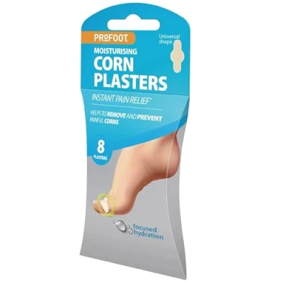 INSTANT PAIN RELIEF - Instant Pain Relief: Profoot Moisturising Corn Plasters provide immediate comfort from painful corns, ensuring quick and effective pain relief. HYDROCOLLOID PLASTERS - Utilises innovative hydrocolloid technology to moisturise and soften hardened skin around corns, making removal easier and preventing new corns from forming. UNIVERSAL FIT - Meticulously designed with a universal shape to fit any part of your toes or feet, these plasters offer maximum comfort and stay firmly in place throughout the day. WATERPROOF PLASTERS - Designed to be waterproof, Profoot Corn Plasters remain effective even when wet, making them perfect for active lifestyles. 8 PLASTERS - Each pack includes 8 individual plasters, providing a cost-effective and portable solution for ongoing corn treatment and prevention.