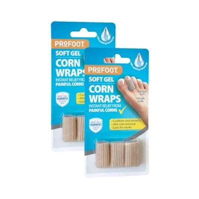 CORN PROTECTION - Profoot SoftGel Corn Wraps provide a complete solution for relieving corns. With their wrap-around protection, these wraps reduce pressure and friction on the skin. RELIEVES AND PREVENTS - The medical-grade mineral oil formula softens corns and surrounding areas, effectively eliminating tough corns and preventing new ones from developing. LOW-PROFILE DESIGN - Experience relief without compromising your footwear's fit. The low-profile design of our Corn Wraps ensures they won't interfere with your shoe's fit, providing comfort and protection. WASHABLE AND REUSABLE - Each pack contains 3 washable and reusable corn wraps, offering a long-lasting solution to relieve pain from corns. Enjoy weeks of comfort without the need for constant replacements. VERSATILE USAGE - Not just for corns, these wraps serve a dual purpose. Use them as an overnight finger cuticle softener for additional skincare benefits.
