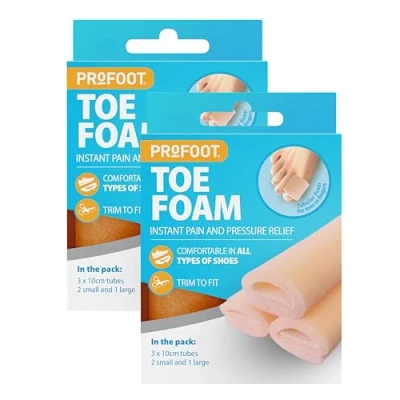 INSTANT RELIEF - Profoot Toe Foam provides effective relief from painful friction and pressure caused by bunions, corns, foot discomfort, and hammer toe, ensuring all-day comfort. EASILY CUT TO SIZE - Each pack includes three tubes—two small and one large—that can be easily cut to the perfect size, offering a personalised fit for any toe. PERFECT FOR ALL SHOES - Profoot Toe Foam can be worn in any type of footwear, making it ideal for those who want to stay active and pain-free, regardless of their shoe choice. FOR BOTH FINGERS & TOES - Profoot Toe Foam isn't just for toes—it can also be used on fingers to alleviate painful friction and pressure, providing comfort and protection wherever you need it most. ALL DAY COMFORT - Whether you're dealing with bunions, corns, or hammer toe, the Profoot Toe Foam adapts to your needs, ensuring maximum comfort and protection throughout the day.