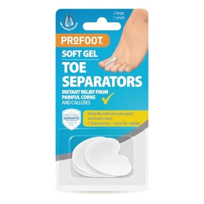 INSTANT RELIEF - The Profoot Soft Gel Toe Separator provides instant comfort by gently separating toes, alleviating the pain and discomfort caused by corns, calluses, and overlapping toes. INFUSED WITH MINERAL OIL - Our Soft Gel Toe Separators contain mineral oil that helps to soften and prevent corns, offering an extra layer of care and protection for your toes. WASHABLE AND REUSABLE - Designed for long-term use, these toe separators are washable and reusable, ensuring they remain effective and hygienic for weeks. THREE SIZES FOR A PERFECT FIT - Each pack includes three separators—two large and one small—to provide a perfect fit for different toe sizes and configurations, enhancing their effectiveness. GENTLE ALIGNMENT - The separators help align your toes properly and relieve sore spots between them, promoting overall foot health and comfort.