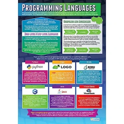 EDUCATIONAL CHART DESIGNED BY TEACHERS: Our Programming Languages poster helps students to learn, engage and remember more information than ever before. Covering the basics of the programming languages topic, this unique school poster can play a vital role in improving both students' understanding and classroom décor. SUPPLEMENT KNOWLEDGE: Our educational school posters are colourful, beautifully illustrated and contain a huge amount of valuable information. This Computer Science poster is specifically designed to help students gain a greater understanding of the programming languages topic. The wall chart is a great resource for Schools, Classrooms, Computer Science Teachers, Students, Tutors, Home School Parents and Home School Kids. MAKE LEARNING FUN: Engaging, clear and colourful designs and images create a fun learning environment in which students can excel. Our amazing wall posters can help to increase students†interest towards Computer Science, while recapping any key information they've been taught. LARGE SIZE – IDEAL FOR READING FROM A DISTANCE: Our school wall charts are a generous size, measuring 594 mm x 850 mm (A1). This ensures all posters are easily readable from a distance. Our educational posters are a fantastic way of brightening and decorating any classroom and can easily complement every type of learning environment. THE UKâ€s NO. 1 PROVIDER: Brought to you by Daydream Education, the UK's leading provider of educational posters for schools, with a range that spans over 25 subjects across key stages 1 – 5. By combining a bold, visual approach with simple, concise information, we have provided over five million resources to more than 50,000 classrooms worldwide.