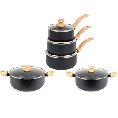 This superb Progress Scandi set includes three generously sized non-stick saucepans and two stockpots for all your culinary needs. PFOA free and made from pressed aluminium, these Scandi pans have durable Smartstone non-stick interiors to ensure hassle free cooking. Suitable for dishwasher cleaning and for use with metal cooking utensils, these pans are great for preparing hearty family meals. Great for use across all hobs including induction, these pans have ergonomic handles for simple manoeuvring around your kitchen. Combining functionality with style, this Nordic inspired pan set has a wood effect finish which will look great in any kitchen setting., Manufacturer: Progress
