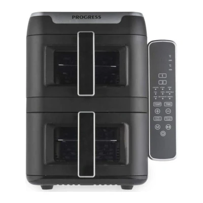 CurrysDouble down at dinner time with this Progress dual tier air fryer. Its stackable design gives you two 4.5L drawers, one on top of the other. So you can cook a bunch of snacks at once - no need to wait around. With its nine presets, you can rustle up all your favourite scran with little to no oil. Enjoy your fried favourites without the guilt. Good to know - Adjust the temperature and select programs in no time - it has easy-to-use touch controls - The drawers are removable and dishwasher-safe, so cleanup is quick and simple - With its 60 minute timer, it'll automatically shut off when your meal is ready - Keep an eye on what's cooking through its viewing window