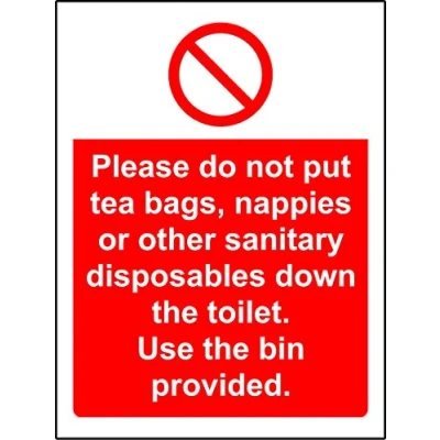 Prohibition signs Please do not put tea bags, nappies, or other sanitary down the toilet use bin provided Safety sign Self adhesive sticker 150mm x 100mm