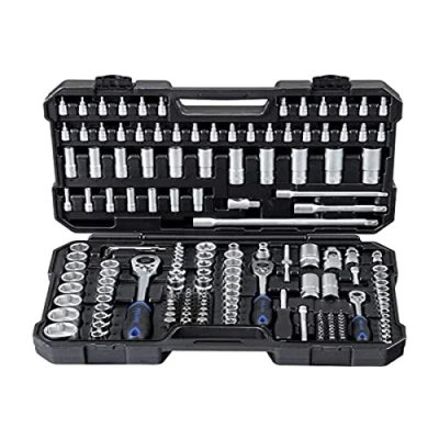 Durable and replaceable clip fasteners. Three reversible ratchets 48 teeth. Bit sockets for all screw-on work. Package weight: 8.46 kg.