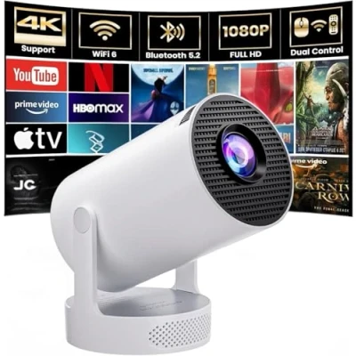 🎥 Crisp 1080P & 4K support Experience sharp, lifelike visuals with 1080P and 4K support on this mini projector. Every scene pops with vibrant colors and crisp contrast, perfect for movies, gaming, and high detail videos. ⚡ Smart Android 11 System This smart projector is powered by Android 11, giving access to over 5,000 apps directly on the device. Enjoy smooth navigation, fast performance, and a clutter free entertainment setup with no extra devices needed. 🔊 Immersive HiFi Audio & Vivid Visuals The built in speaker delivers rich, room filling sound while projecting clear, detailed images. This portable projector provides a balanced audiovisual experience that elevates movie nights, gaming sessions, or streaming. 📶 Smooth WiFi 6 & Bluetooth 5.0 Connection Stream smoothly with WiFi 6 and connect effortlessly via Bluetooth 5.0. Pair headphones, speakers, or other devices for stable, lag free audio. Ideal as a projector for bedroom, home theater, or small living spaces. 🎯 Quick Adjustment & 180° Flexible Projection Automatically corrects distorted images with vertical keystone correction and manual focus. Achieve a perfectly aligned picture in seconds, while the 180° adjustable stand allows easy positioning on walls, ceilings or in compact spaces for a smooth and straightforward setup with this mini projector.