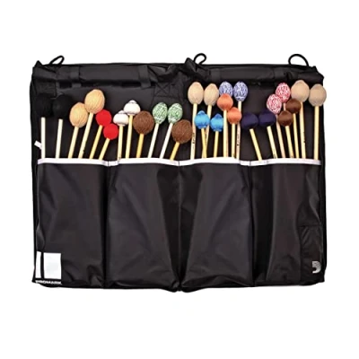 Made from weatherproof ballistic nylon Engineered to maintain an open position when in use for quick stick changes Designed to fit 2 bags across any 4.3 octave marimba or full size vibraphone Features on-the-fly rain guard flaps for quick cover from the elements Field tested and approved by the 17 Time World Champion Concord Blue Devils.