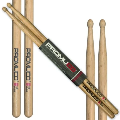 HEAVY OAK BUILD: Very dense oak gives a powerful, weighty feel with outstanding durability made for drummers who really lay into the kit. 5B OAK DIMENSIONS: Approx. 40.5cm length and 1.6cm diameter provide a thick, confident grip and serious mass for loud rock and metal playing. CUTTING ATTACK: Oaks hardness delivers strong, defined attack on drums and cymbals, helping patterns remain clear at very high stage volumes. WOOD TIP TONE: Wood tip balances the aggressive stick feel with a warmer, more musical cymbal sound than nylon ideal for big rock rides and crashes. PROMUCO ROCK PEDIGREE: Part of Promuco's Oak drumstick line from the British brand established in 1964, echoing the kind of sticks favoured by classic heavy rock players.