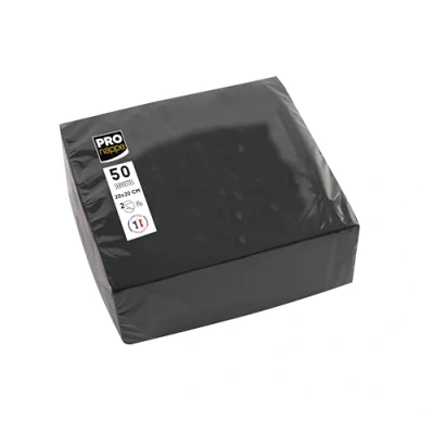 The Pronappe brand offers tableware products: tablecloths, napkins, plates, cups in bright and trendy colours to receive in the best way Our 2-ply napkins will bring you maximum comfort and give your table the elegance it deserves Ideal for restaurants and at home, for all occasions: birthdays, weddings, christenings, Christmas. The double stitch micro-embossing gives them thickness and hold conducive to your folding desires Their size 20 x 20 cm is ideal for use in cocktails, aperitifs for standing or sitting or for decorative settings under glasses. These FSC certified towels are responsibly sourced from embarrassed sources Products made in France and certified in accordance with food contact. Suitable ink will not fade or fade in light. Sold in packs of 50 cocktail napkins, black