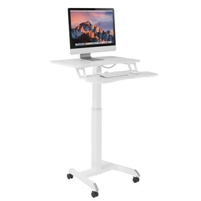 ✅【Health & Wellbeing】: Evidence suggests that sitting for long periods can cause a number of health concerns such as varicose veins, back pain and neck strain. Stand & sit throughout the day with this ProperAV workstation! ✅【Laptop/Tablet Compatible】: Place your laptop or tablet on the workstation with an additional keyboard and mouse tray for mobile working. Choose between sitting and standing throughout the day! ✅【Sit to Stand】: The height of this mobile workstation can be adjusted from 800-1200mm & tilted 0°-30° for optimal working or presenting. ✅【Ergonomic Two Tier Worktop】: Desk dimensions: 800x400mm, Keyboard Tray: 793x300mm, Maximum Capacity: 8kg ✅【Gas Spring Adjustment】: Sit to stand in one easy smooth motion with the pneumatic foot pedal. Get your optimal height in one quick, simple adjustment. ✅【Easy Assembly】: This sit-stand desk comes preassembled with clear instructions.