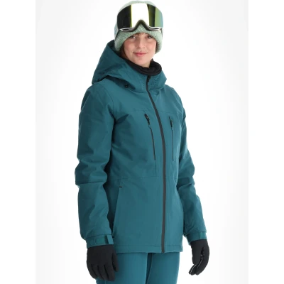 Protest PRTBEVERLY insulated ski jacket for women. A purpose-built jacket that combines high weather protection with practical on-mountain features, designed in a slim fit for a streamlined silhouette. Constructed from PVRE Green polyester from the PVRE series, the jacket offers a waterproof rating of 20,000 mm H2O and breathability of 20,000 g/m2/24h. All seams are fully taped and the main zippers are waterproof. A chin protector on the front zip prevents rubbing and increases comfort when the jacket is closed up. Insulation is calibrated to warmth level 4, providing substantial thermal protection for cold conditions. A fixed hood and a fixed snow gaiter help keep out wind and snow during long days on the piste. The fabric is windproof and breathable, allowing moisture transport during active use. Practical detailing includes underarm ventilation zips for rapid temperature control, pre-shaped sleeves for freedom of movement, and a range of pockets. There is an inner pocket, a goggle pocket, a vertical chest pocket and a dedicated ski pass pocket. Cuffs and sleeves are finished to reduce snow ingress and improve fit. The slim fit follows normal sizing and works well with mid-layers. The overall style sits in the urban snow category, so the jacket is suitable for resort skiing and general winter use where weather protection and technical performance are required.