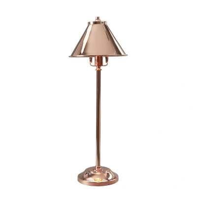 Crafted from polished copper, the Provence table lamp showcases a sleek, industrial design that seamlessly fits into a variety of interiors. The lamp features a slender rod gracefully supporting a conical lampshade, which diffuses light in a gentle, glare-free manner. This thoughtful design not only illuminates but also enhances the ambiance of your room, making it ideal for a bedside table, a desk, or a buffet dresser.