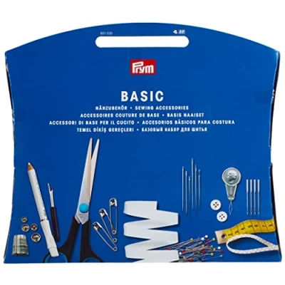 Starter kit for your sewing box or sewing kit for singles Content: pins, safety needles, sewing/embroidery/darning needles, sewing machine needles, measuring tape, sew-on poppers, thimble, needle threader, stitch divider, chalk, rubber cord, cotton tape, plastic fasteners, scissors