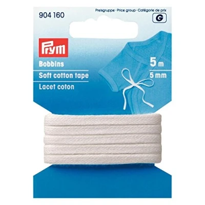 Soft cotton ribbon for baby clothing Soft cotton ribbon for attaching and decorating Suitable for attaching small jackets or for decorating nightgowns Made from 100% cotton This package contains: Prym Bobbins Ribbon - 5mm