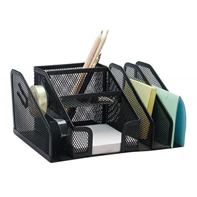 Q-CONNECT KF16573 Office Set Schreibtisch-Organizer 6 Fächer und Bandspender/ Klebebandabroller , aus metall. Farbe: schwarz. Schreibtischorganizer für: 3 Korrespondenzfächer, 1 Fach für Schreibwaren, 1 Fach für kleines Bürozubehör (Gummis, Büroklammern, etc.), 1 Kartenfach, 1 Fach mit Bandspender mit Gummifüßen/ Anti-Rutsch-Füße Abmessungen: 205 x 145 x 100 mm